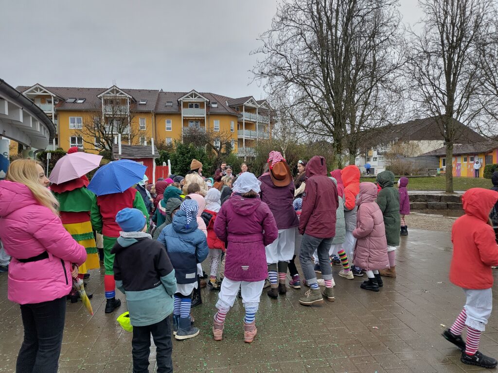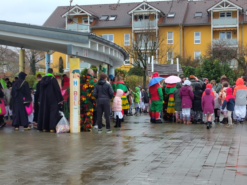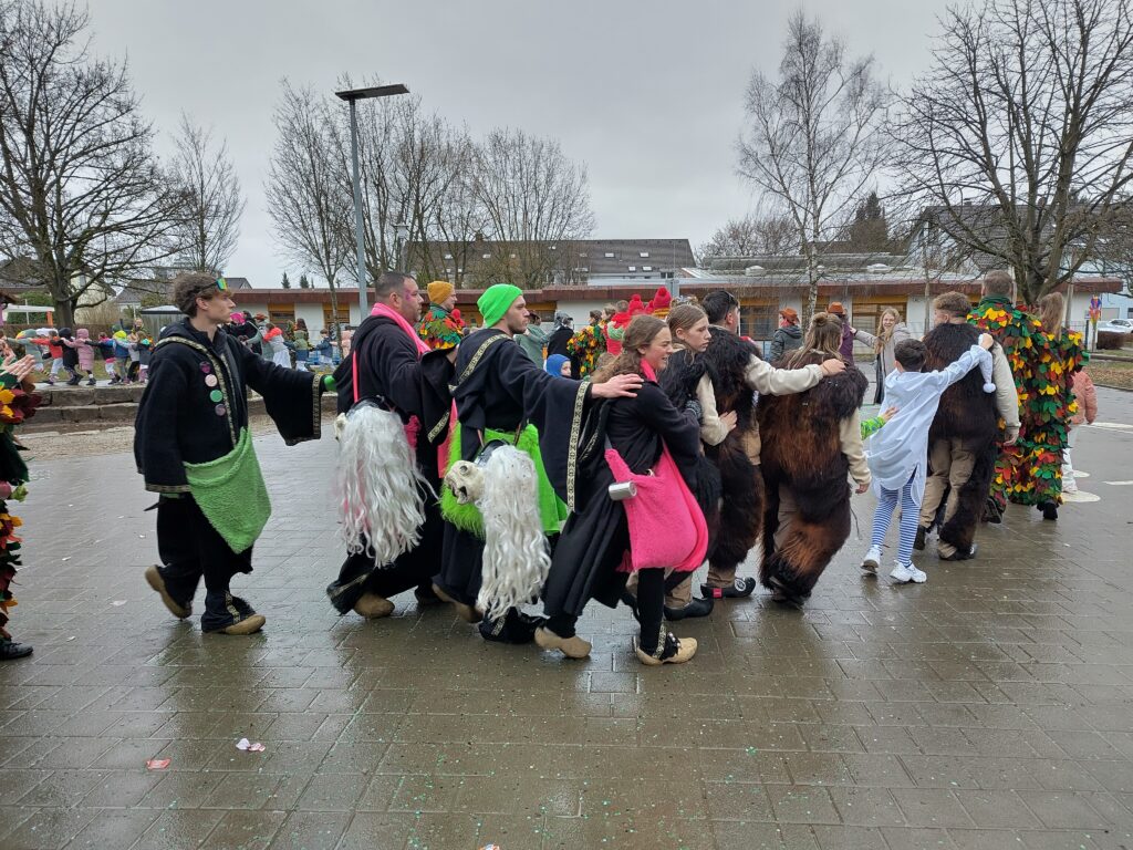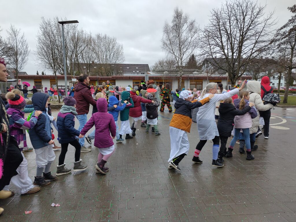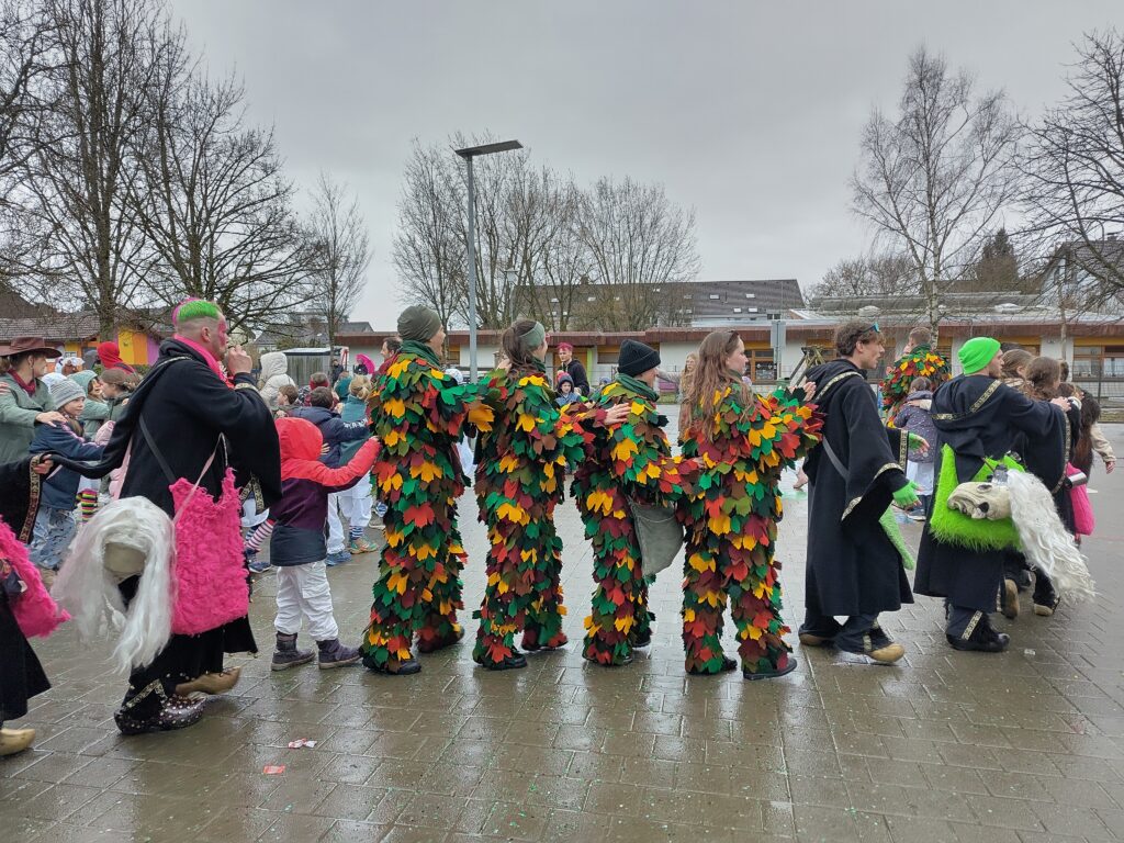Die örtlichen Fasnachtscliquen „befreiten“ die Schülerinnen und Schüler vom Unterricht. Auch das einsetzende Regenwetter konnte niemanden davon abhalten, auf dem Schulhof zu feiern und zu tanzen. Die Kinder sammelten eifrig die geworfenen Süßigkeiten.